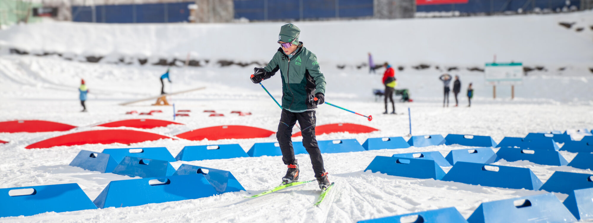 Im Linienslalom musst du wie die Alpinen in einer Vertikalkombination eine möglichst gerade Linie wählen. Deine Beine arbeiten flink. Suche die direkte Linie. Lauf dynamische Richtungswechsel.